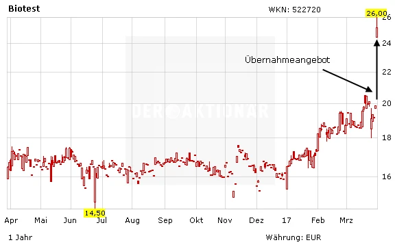 Creat bietet lediglich 19,00 Euro für die Biotest-Vorzugsaktie und somit sogar zwei Cent unter dem gestrigen Xetra-Schlusskurs. Das Angebot für die Stammaktie liegt deutlich darüber. Mit einem Angebotspreis von 28,50 Euro pro Papier winkt ein Aufschlag von rund 43 Prozent – und das aus gutem Grund.
