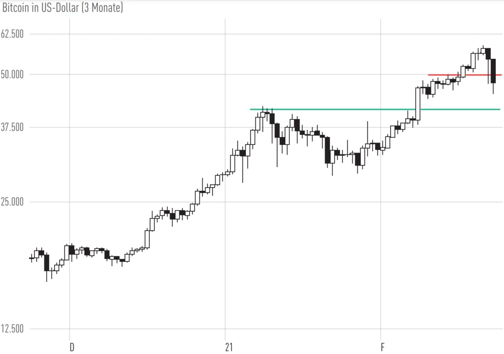 Nach dem nahezu parabolischen Anstieg der letzten Monate ist ein deutlicherer Rückschlag beim Bitcoin nicht ungewöhnlich. Auf den Ausbruch über die Marke von 40.000 Dollar im Januar folgte zunächst ebenfalls ein mehr als 20-prozentiger Dip, ehe die Rallye wieder Fahrt aufgenommen hat. Hinzu kommt: Selbst auf dem aktuellen Niveau steht der Bitcoin-Kurs noch mehr als doppelt so hoch wie vor drei Monaten.