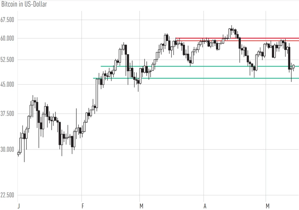 Der Rückzieher von Elon Musk bei den erst vor wenigen Wochen eingeführten Bitcoin-Zahlungen hat am Kryptomarkt für ein Beben gesorgt. Der Bitcoin-Kurs ist um bis zu 15 Prozent eingeknickt und dabei zum ersten Mal seit Anfang März unter die Marke von 47.000 Dollar zurückgefallen. Schnäppchenjäger wie Michael Saylor haben den Kursverfall aber zum (Nach-) Kauf genutzt und den Bitcoin bereits wieder über dir psychologisch wichtige 50.000er-Marke gehievt.