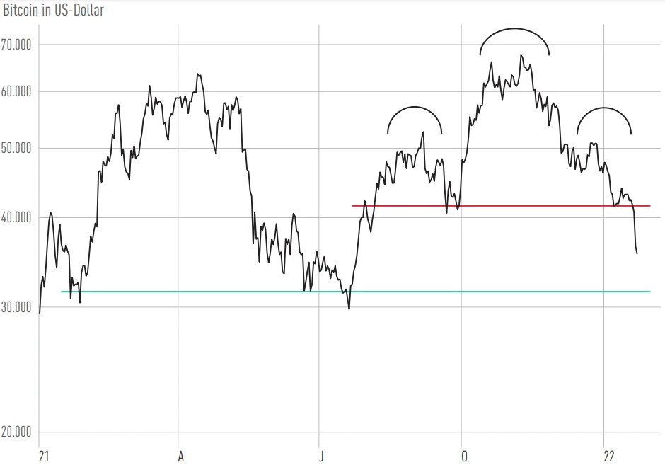 Rein technisch betrachtet habe der Bitcoin durch den Bruch der Nackenlinie im Bereich von 38.300 Dollar eine „gigantische Schulter-Kopf-Schulter-Formation“ aufgelöst, so David Lifchitz, Chief Investment Officer bei ExoAlpha, gegenüber dem Branchenportal cointelegraph.com – ein charttechnisches Verkaufssignal.