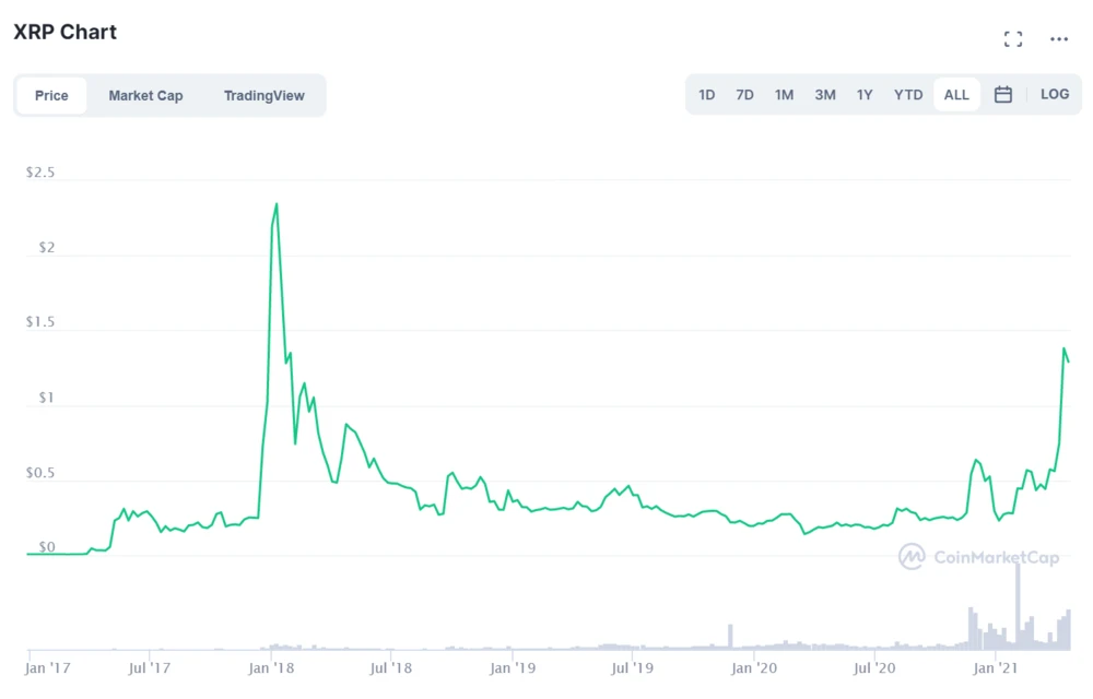 Laufende Ermittlungen der US-Börsenaufsicht SEC gegen Ripple und Mitglieder des Managements hatten den Kurs des als „Banken-Bitcoin“ bekannte und oft auch kritisierte Token seit Ende 2020 belastet. Nach juristischen Teilerfolgen startete Anfang April eine Erholungs-Rallye, die den Kurs in der Spitze um bis zu 240 Prozent nach oben katapultiert hat. Dennoch wird XRP auf dem aktuellen Niveau noch mit einem über 60-prozentigen Abschlag vom Allzeithoch aus dem Januar 2018 gehandelt.