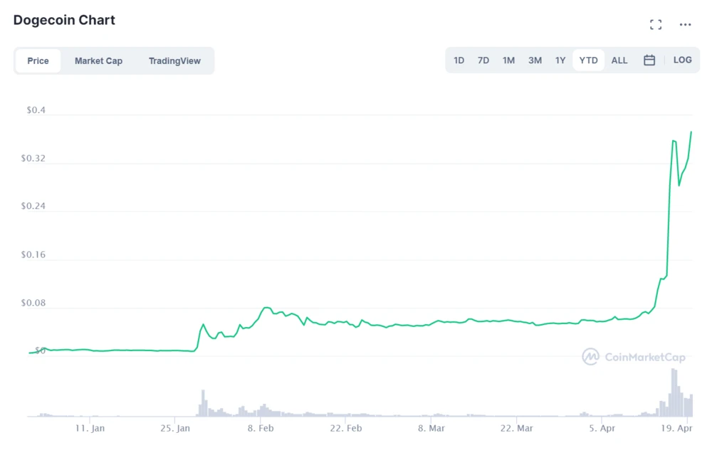 Dogecoin, Bitcoin-Parodie und Lieblings-Kryptowährung von Stars wie Elon Musk, hat alleine in der Vorwoche einen schier unglaublichen Kurssprung von rund 500 Prozent hingelegt und am Freitag bei rund 0,44 Dollar ein neues Allzeithoch markiert. Nach dem nahezu parabolischen Anstieg war das Rückschlagrisiko hier besonders hoch, weshalb der Kurs am Wochenende kurzzeitig um mehr als 40 Prozent vom jüngsten Hoch zurückgekommen ist.