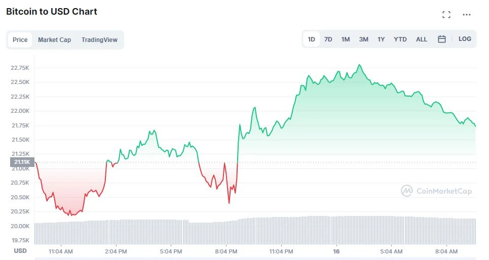 Der Blick auf den Tageschart zeigt: In der ersten Reaktion auf den Fed-Zinsentscheid ist der Bitcoin-Kurs am Mittwochabend gefallen, anschließend aber innerhalb weniger Stunden um bis zu neun Prozent bis auf 22.869 Dollar nach oben geklettert. Einige Investoren hatten offenbar eine noch stärkere Erhöhung des US-Leitzinses als die nun verkündeten 75 Basispunkte erwartet. Seit dem frühen Donnerstagmorgen kam er anschließend etwas zurück und versucht sich an einer Stabilisierung oberhalb von 21.500 Dollar.