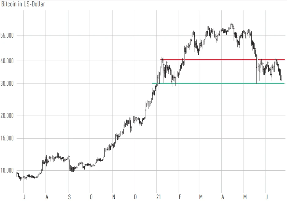 Solange der Kurs in der Seitwärtsrange zwischen 30.000 und 40.000 Dollar notiert, ändert sich zunächst nichts am übergeordneten Chartbild – der Bitcoin bleibt auf Richtungssuche. Langfristig investierte Anleger bleiben dabei, Neueinsteiger warten an der Seitenlinie auf eine Entscheidung.