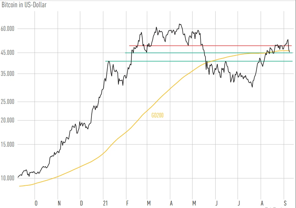 Inzwischen scheint den Bullen jedoch die Puste auszugehen, denn am Mittwochmorgen taumelt der Bitcoin wieder in Richtung 45.000 Dollar und den wichtigen Chartmarken, die dort verlaufen. Neben der horizontalen Unterstützung in diesem Bereich ist das vor allem die 200-Tage-Linie, die er nun nachhaltig zu unterschreiten droht.