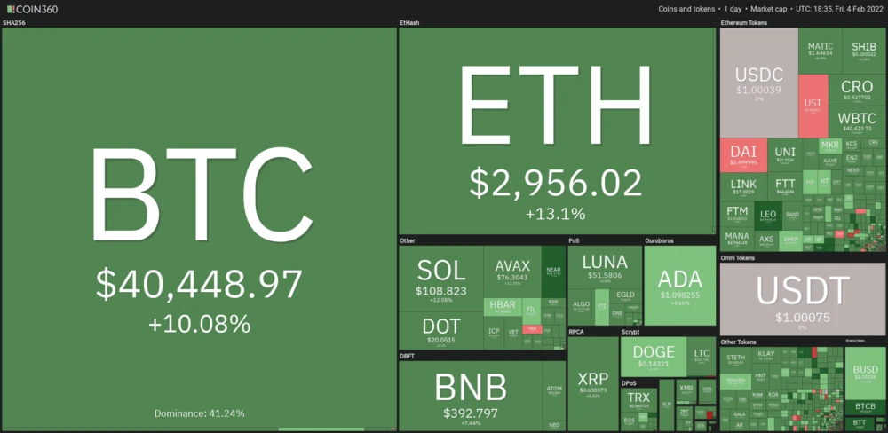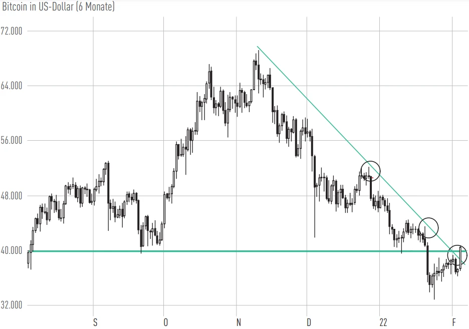 Auf 24-Stunden-Sicht notiert die digitale Leitwährung am Abend rund zehn Prozent höher bei rund 40.440 Dollar – und damit auf dem höchsten Stand seit über zwei Wochen. Mit dem starken Move wurde zudem die seit dem Allzeithoch von Anfang November gültige Abwärtstrendlinie geknackt und anschließend direkt der horizontale Widerstand bei rund 40.000 Dollar überwunden.