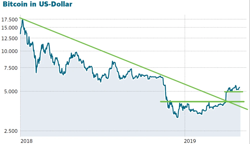 Zumindest der Bitcoin hat den ersten Schreck inzwischen aber abgeschüttelt und nähert sich mit einem moderaten Kursplus wieder der Marke von 5.500 Dollar. Insgesamt bleibt das Chartbild somit aussichtsreich. Risikobewusste Anleger setzen im Jahresverlauf auf eine Rückkehr in den fünfstelligen Bereich.