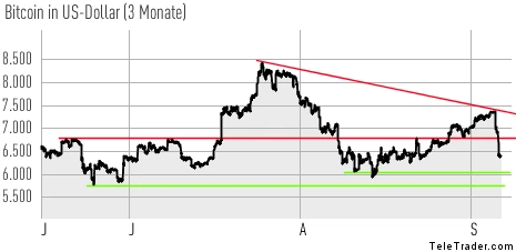 Auch der Bitcoin kann sich dem allgemeinen Abwärtstrend nicht entziehen und verliert rund 13 Prozent. Die leicht positive Tendenz im Chartbild, die sich seit Mitte August herauskristallisiert hatte, ist damit nun wieder passé: Statt auf dem Weg nach oben den Widerstand im Bereich von 7.700 Dollar ins Visier zu nehmen, ist der Kurs zunächst bis auf 6.404 Dollar abgerutscht.