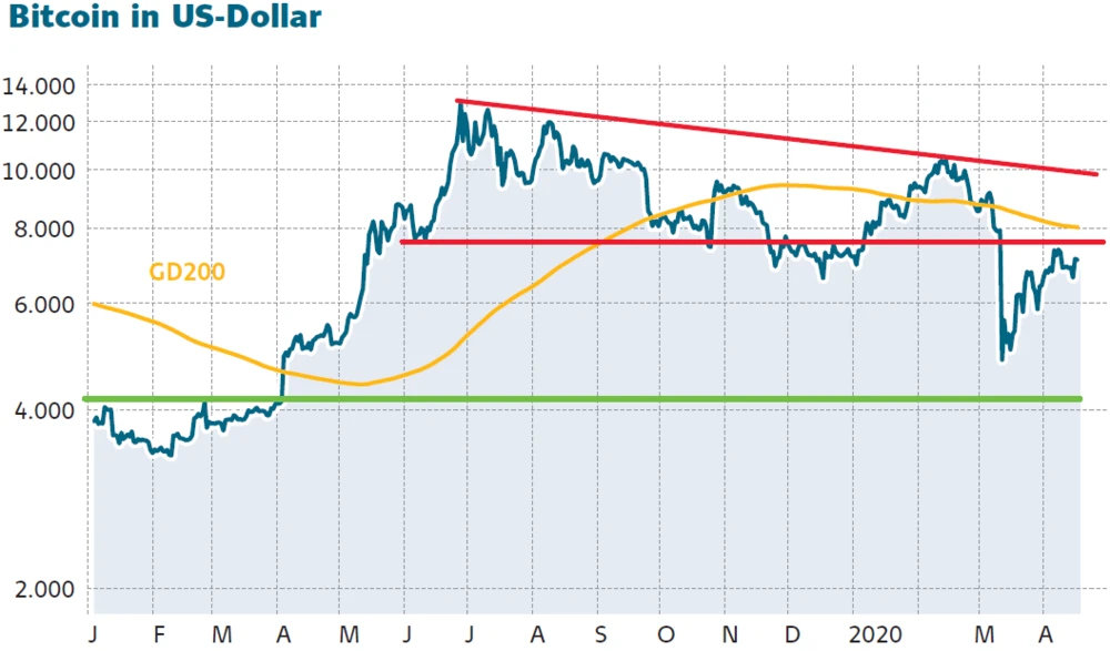 Seit seinem Krisentief vom 13. März bei rund 4.100 Dollar hat der Bitcoin in der Spitze wieder bis zu 80 Prozent zugelegt. Nach einer zwischenzeitlichen Konsolidierung notiert er aktuell im Bereich von 7.100 Dollar. Mit Blick auf den Chart bleiben die Widerstände im Bereich von 7.400 und 8.000 Dollar die nächsten Hürden, die es zu überwinden gilt. Kurzfristig könnte das „Halving“ Mitte Mai Impulse für einen Vorstoß in diese Kursregion und darüber hinaus liefern.