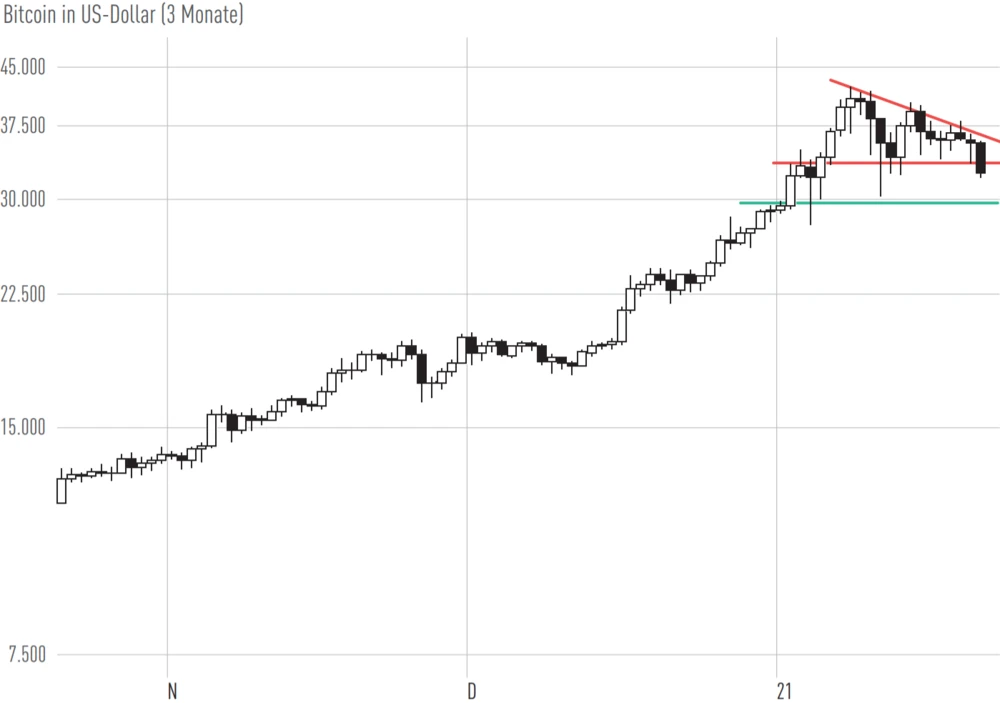 Investierte Anleger beißen daher die Zähne zusammen und bleiben dabei. Neueinsteiger können eine Stabilisierung oberhalb von 30.000 Dollar zum Kauf nutzen.