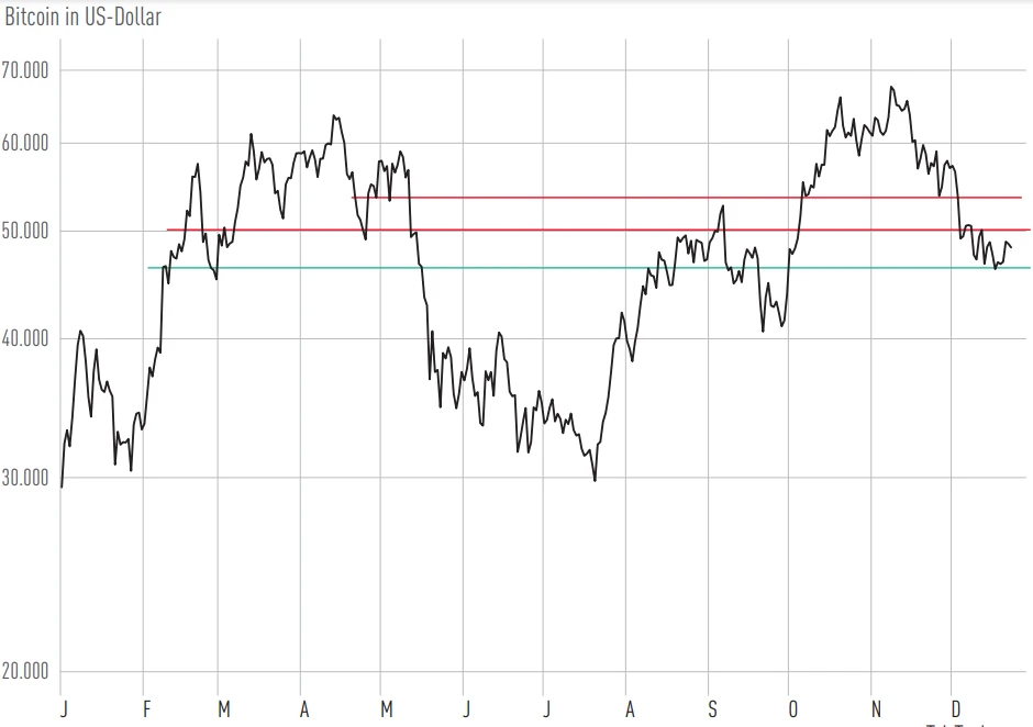 Damit sich das Chartbild und die Stimmung weiter aufhellt, müsste der Bitcoin neben der psychologisch wichtigen 50.000-Dollar-Hürde auch die charttechnisch bedeutendere Widerstandszone im Bereich zwischen 50.500 imd 51.500 Dollar nachhaltig überwinden, berichtet das Branchenportal Cointelegraph unter Verweis auf Chart-Profi Michael van de Poppe. Insgesamt rechne er 2022 mit einem „großartigen Jahr“.