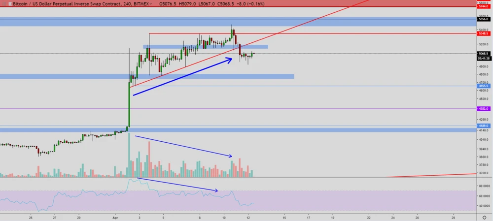 Charttechnisch sah der Chart bis dahin sehr bullish aus. Wie bereits oben erwähnt: Höhere Tiefs und das aufsteigende Dreieck sind an sich eher bullishe Chartmuster, da die Wahrscheinlichkeit nach oben auszubrechen höher ist. Außerdem konnte man sich seit einer Woche klar über der psychologisch wichtigen 5.000-Dollar-Marke halten. Der Chart an sich gab also nicht viele bearishe Signale, abgesehen davon, dass nach so einer starken Aufwärtsbewegung natürlich irgendwann eine Korrektur erwartet wird. Konkreter wird es, wenn Divergenzen beim Volumen und beim RSI (Relative Strength Index) betrachtet werden.
