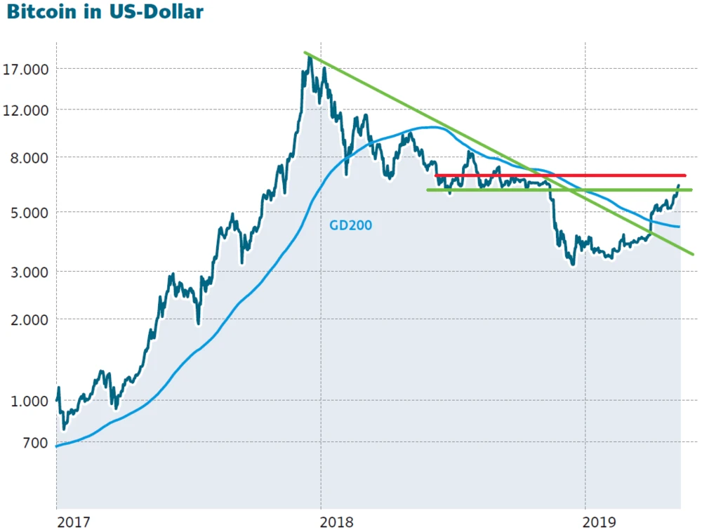 Gelingt es dem Bitcoin, auch die obere Begrenzung dieser Zone bei rund 6.800 Dollar zu überwinden, würden die Chancen auf fünfstellige Kurse im weiteren Jahresverlauf deutlich steigen.