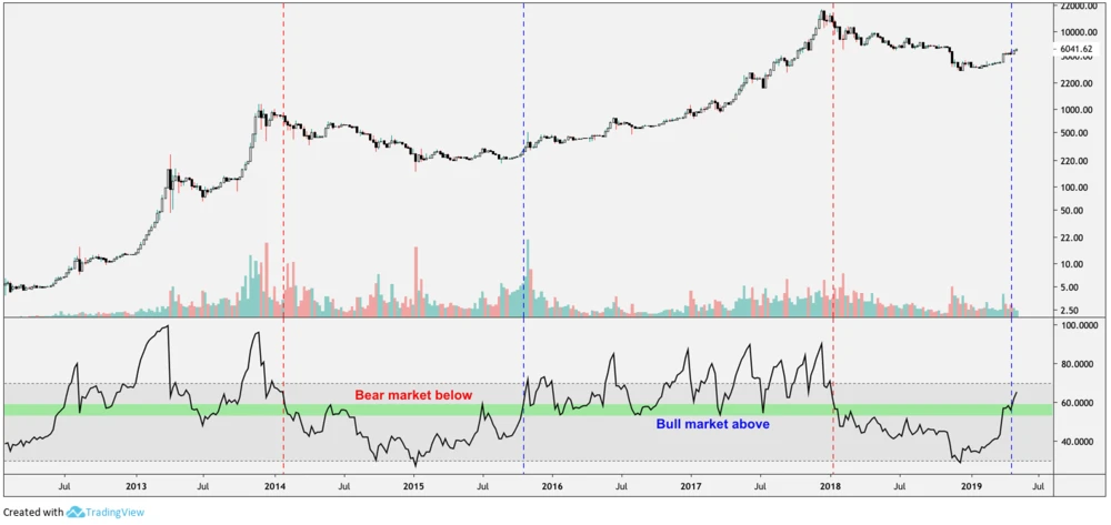 Hoffnung auf eine Fortsetzung der Aufwärtsbewegung des Bitcoin macht der Relative-Stärke-Index RSI. Dieser hat auf Wochensicht einen Wert von 65 erreicht. Das ist nicht nur der höchste Stand seit Anfang Januar 2018, sondern deutet auch auf längerfristiges bullishes Momentum hin. Ausgeschöpft ist das Potenzial damit aber noch nicht, denn erst ab einem RSI-Wert über 70 gilt ein Wert als überkauft.