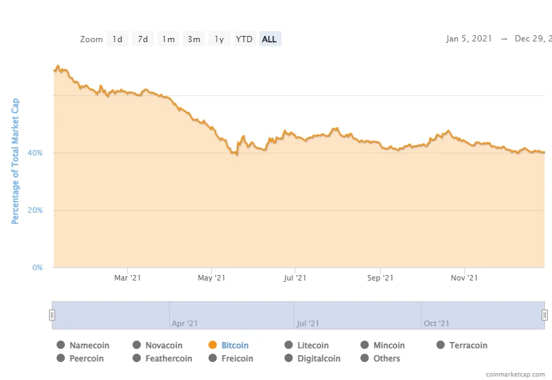 Zum Vergleich: Zu Jahresbeginn 2021 hatte die Bitcoin-Dominanz bei fast 70 Prozent gelegen. Im Mai hatte die Kennzahl schon einmal kurzzeitig die 40-Prozent-Marke unterschritten, sich anschließend aber wieder auf bis zu 49 Prozent erholt.