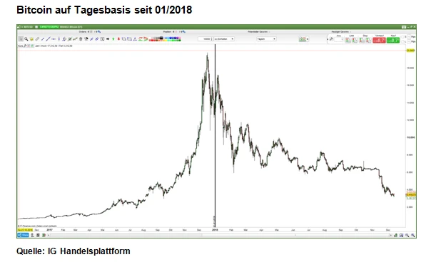 "Fundamental gesehen ist es schwierig. Der Markt ist weiterhin sehr intransparent und ineffizient. Dies mag auch Grund sein, für die abwartende Haltung der US-Börsenaufsicht (SEC). Diese lehnte bereits mehrmals die Einführung von Bitcoin-ETFs ab. Charttechnisch gesehen, könnte der Kurs bei rund 2.980 US-Dollar einen ersten markanten Boden erfahren. Gelingt der Nachfrageseite eine nachhaltige Verteidigung der psychologischen Marke bei 3.000 US-Dollar, könnte im nächsten Jahr eine neue Rallye eingeleitet werden", lautet das Fazit von Salah Bouhmidi von IG Markets.
