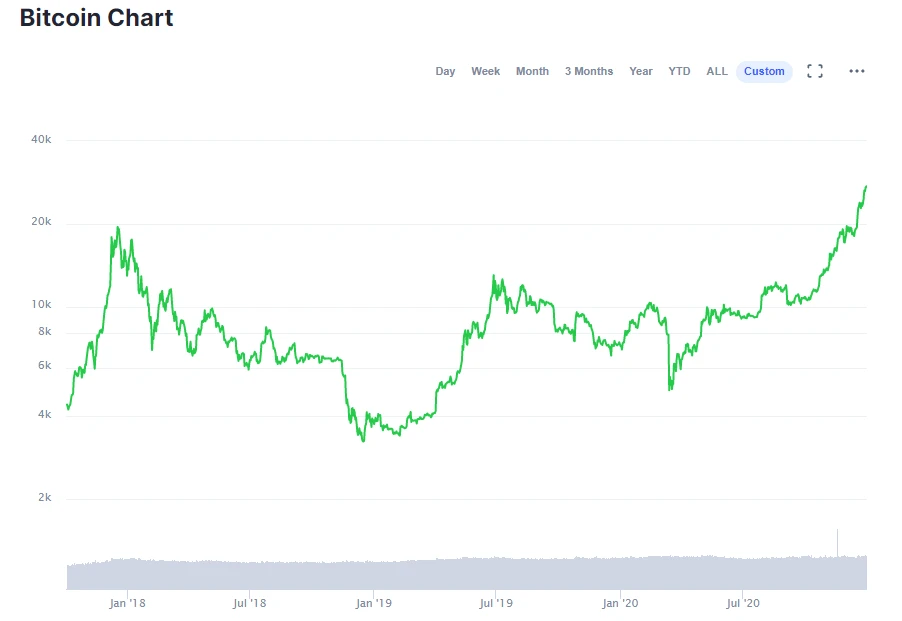 Der Bitcoin gibt zum Jahresende noch einmal Gas und klettert am Mittwoch um rund fünf Prozent nach oben. Am Morgen hat er dabei sogar das Hoch vom Weihnachtswochenende hinter sich gelassen und bei 28.537 Dollar einen neuen Höchststand markiert. Das Interesse der breiten Öffentlichkeit nimmt derweil zu.