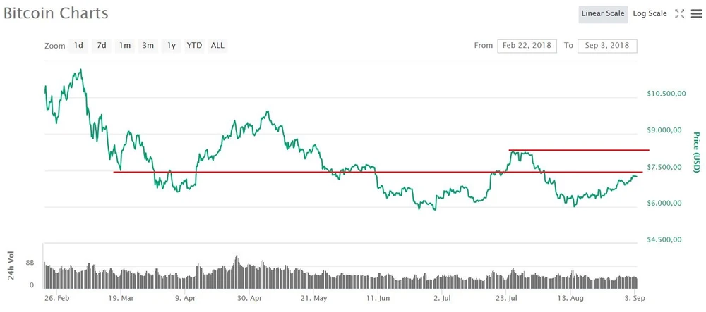 Eine deutlich größere Hürde stellt der Widerstand bei 8.400 US-Dollar dar. Hier bissen sich die Bitcoin-Bullen nach einem rasanten Kursanstieg gegen Ende Juli bereits die Zähne aus.