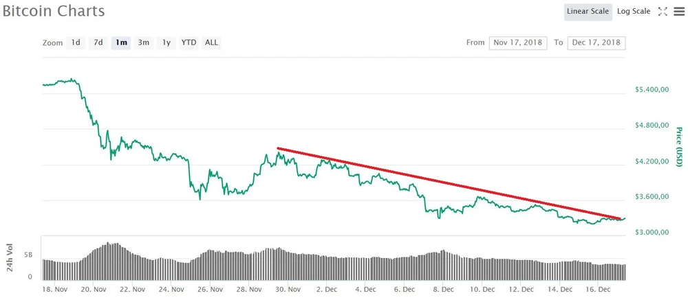 Aus der optimistischen Sichtweise könnte man von einer Stabilisierung des Bitcoin-Preises sprechen. Seit Freitag notiert der Kurs stabil über 3.200 US-Dollar und kann zu Wochenbeginn sogar leicht zulegen.