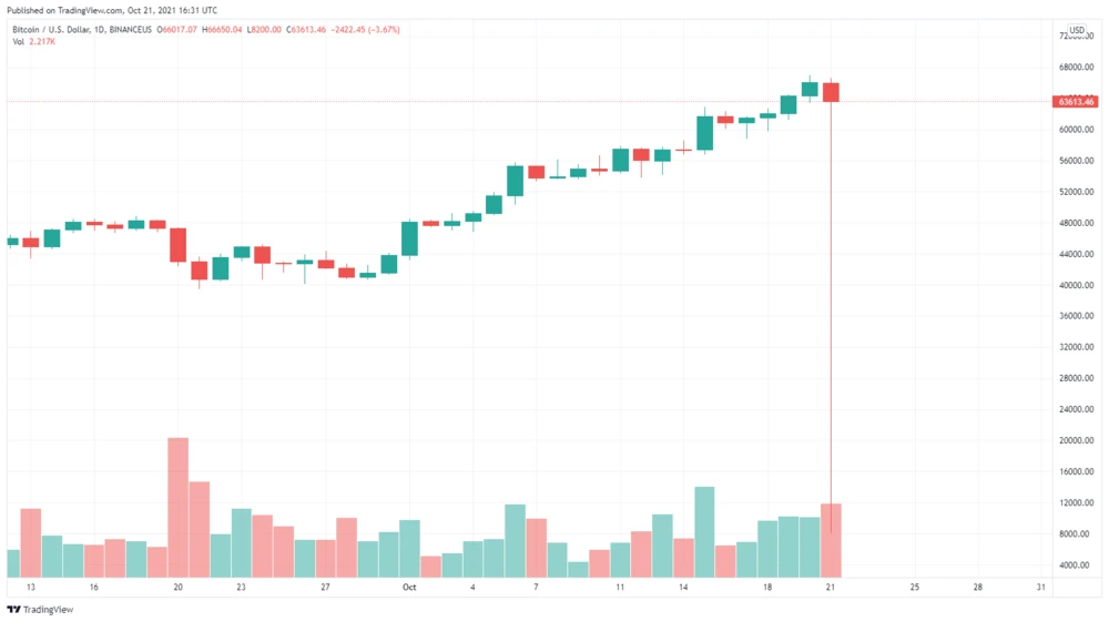 Um 7.34 Uhr New Yorker Zeit ist der Bitcoin-Kurs bei Binance US von 65.815 Dollar bis in den Bereich von 8.200 Dollar abgesackt. Für etwa eine Minute unterschied sich der Kurs damit massiv von anderen Handelspattformen, wo der vermeintliche Flash-Crash nicht zu beobachten war. Anschließend sprang der Kurs auch bei Binance US wieder auf das vorherige Niveau knapp unter dem gestrigen Allzeithoch zurück.