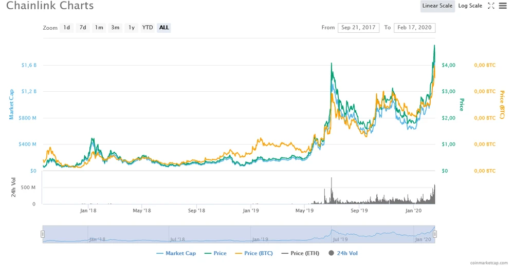 Chainlink (LINK) hat es sich zur Aufgabe gemacht, die Visionen der Blockchain-Community mit der realen Welt in Einklang zu bringen. Der dezentrale Oracle-Service soll Smart Contracts mit klassischen Anwendungen kompatibel machen. Der Shootingstar 2019 belegt seit Monaten gute Plätze im Krypto-TSI-Ranking und nimmt auch im neuen Jahr viel Schwung auf. Getrieben wird das Interesse von in sozialen Medien aktiven Kryptotradern, die nun kurzfristig ein neues Hoch bei 5,00 Dollar als Ziel ausrufen. Tatsächlich ist der kurzfristige Aufwärtstrend voll intakt und Chainlink eines der spannendsten Projekte für 2020. Chainlink hat auf 52-Wochen-Sicht 2.100 Prozent (!) zugelegt.