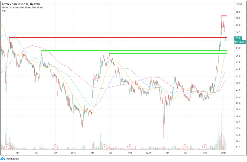 Genauso wie die Kryptowährung hat sich auch die Bitcoin Group prächtig entwickelt. Beide Werte haben aber nun mit enormen Rücksetzern zu kämpfen. Seit dem Mehrjahreshoch Mitte Dezember hat die Aktie zeitweise um rund 40 Prozent einbüßen müssen. Das muss jetzt geschehen, damit der steile Anstieg weitergehen kann.