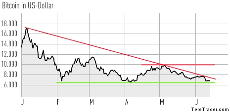 Aus technischer Sicht sollte die Unterstützung im Bereich von 6.600 Dollar Halt geben – unterhalb dieser Marke wartet das bisherige Jahrestief von Anfang Februar. Auf der Oberseite gilt es, den Widerstand im Bereich von 7.700 Dollar zu brechen, ehe wieder an einen Anlauf auf die altbekannten Widerstandszonen im Bereich von 10.000 und 12.000 Dollar zu denken wäre. Impulse liefern könnte dabei ein Ausbruch aus dem seit Jahresbeginn gültigen Abwärtstrend.