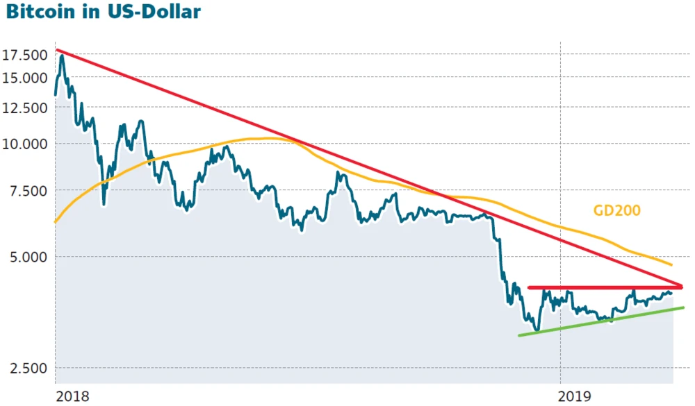 Dieses stellt auch die obere Begrenzung des seit Dezember 2018 gültigen Seitwärtstrends dar. Knapp oberhalb von 4.200 Dollar verläuft zudem der seit über einem Jahr gültige Abwärtstrend – ein Sprung über beide Marken und der damit verbundene Ausbruch aus der Dreiecksformation wäre ein technisches Kaufsignal.
