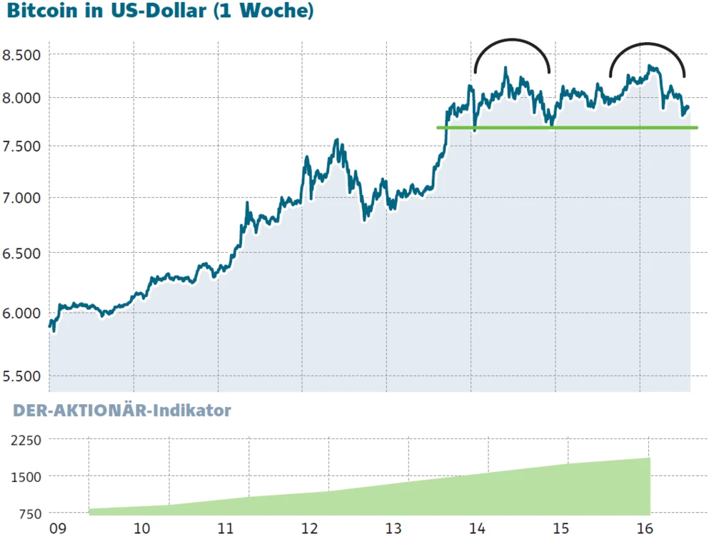 Nachdem der Bitcoin die 8.300-Dollar-Marke auch im zweiten Anlauf innerhalb weniger Tage nicht nachhaltig überwinden konnte, hat der Kurs in diesem Bereich ein Doppeltop gebildet. Diese Chartformation kann auf eine Trendwende hindeuten, weshalb Anleger bei weiteren Verlusten zunächst die Nackenlinie im Bereich von 7.600 Dollar im Auge behalten sollten.