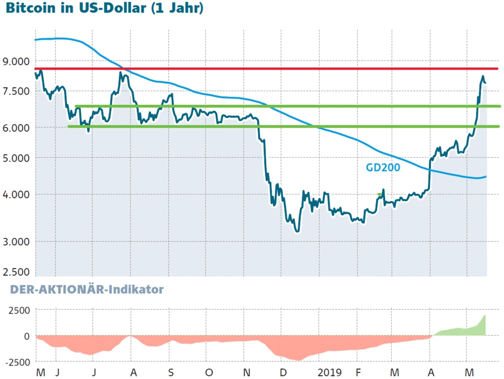 Auf der Oberseite bleibt das 52-Wochen-Hoch von Ende Juli 2018 bei rund 8.500 Dollar das nächste Zwischenziel. Nach dem starken Comeback seit Anfang April und dem mühelosen Sprung über die Schlüsselwiderstände zwischen 6.000 und 6.800 Euro hält der AKTIONÄR im weiteren Jahresverlauf nun wieder fünfstellige Kurse für möglich.