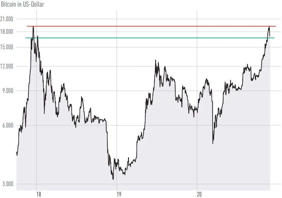 Trotz des Rücksetzers ist das Rekordhoch im Bereich von 20.000 Dollar noch in Reichweite – 17 Prozent trennen den Bitcoin aktuell von seinem Allzeithoch. Wer sich an die Rallye im Jahr 2017 zurückerinnert, der weiß: An besonders guten Tagen macht der Bitcoin so einen Sprung quasi aus dem Stand.