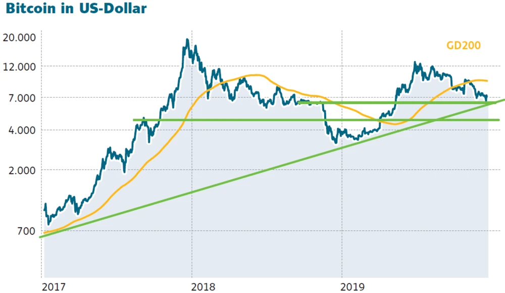 Zuvor war der Kurs in den letzten Tagen jedoch spürbar unter Druck geraten. Nach dem Rückfall unter die 7.000-Dollar-Marke am Samstag wurde auch die charttechnische Unterstützung im Bereich von 6.800 Dollar gerissen. Im Bereich des November-Tiefs bei rund 6.500 Dollar haben jedoch die Bullen das Ruder am Donnerstag herumgerissen. Dort verläuft auch die langfristige Aufwärtstrendlinie.