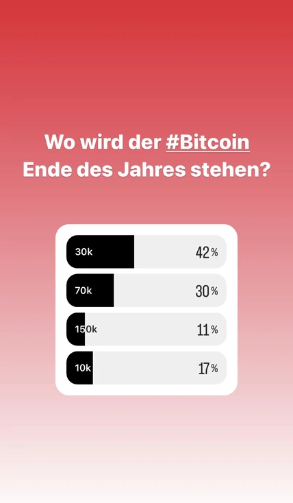 „Wo wird der Bitcoin zum Jahresende stehen“, hat DER AKTIONÄR die Follower bei Instagram am Freitag gefragt – und ein durchaus überraschendes Ergebnis bekommen. 42 Prozent der insgesamt 2.377 Umfrage-Teilnehmer gaben an, dass sie Ende 2023 einen Bitcoin-Kurs von 30.000 Dollar erwarten. Das bedeutet zwar einerseits, dass der Bitcoin auf dem aktuellen Niveau nahezu fair bewertet wäre und in der zweiten Jahreshälfte folglich nicht mehr weiter steigen würde.