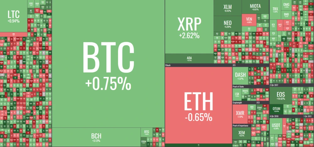 Im Gegensatz dazu gibt es unter den Top 25 Kryptowährungen nach Marktkapitalisierung auf Sicht von 24 Stunden auch große Gewinner. Cardano, EOS, IOTA und Ethereum Classic legten jeweils im niedrigen zweistelligen Prozentbereich zu. Und Qtum eilte mit einem Plus von über 35 Prozent allen davon.