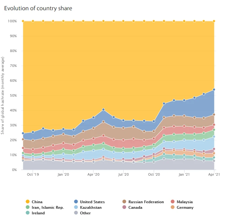 Laut Daten des Cambridge Bitcoin Electricity Consumption Index (CBECI) ist der Anteil chinesischer Miner an der gesamten Rechenleistung (Hash Rate) im Bitcoin-Netzwerk im April 2021 auf rund 46 Prozent gesunken. Zu Beginn der Aufzeichnungen im September 2019 lag der Anteil noch bei 75,5 Prozent.