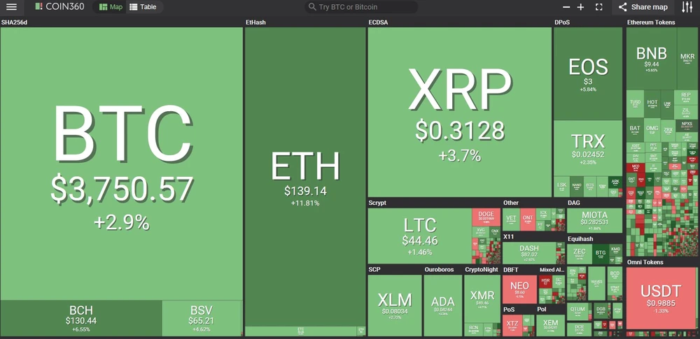 Die Kryptowährungen starten grün in die Woche. Neben dem Bitcoin mit einem Kurszuwachs von knapp drei Prozent können fast alle Top-20-Kryptos zum Wochenbeginn zulegen. Das größte Plus mit über zehn Prozent verzeichnet Ethereum.