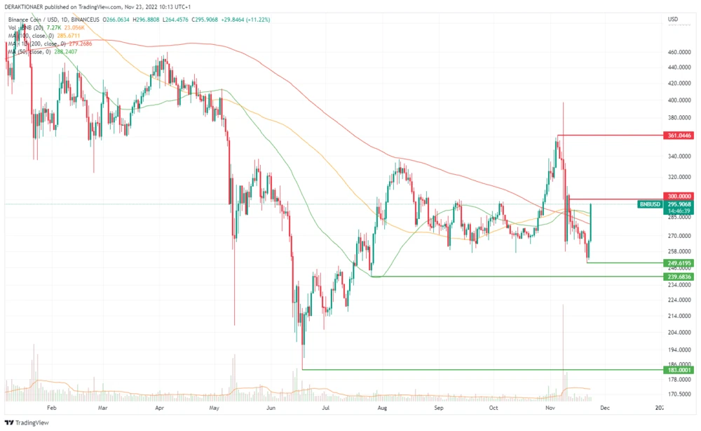 Aktuell läuft eine technische Gegenbewegung am Kryptomarkt. Die globale Marktkapitalisierung steigt in den vergangenen 24 Stunden laut CoinMarketCap um 5,7 Prozent auf 826,5 Millarden Dollar. Anleger zieht es besonders in den Binance-Coin (BNB). Die größte Kryptobörse der Welt und Ihr Token scheinen aktuell als Zufluchtsort zu fungieren. BNB notiert aktuell 11,4 Prozent fester und steht kurz vor der psychologisch wichtigen 300-Dollar-Marke.