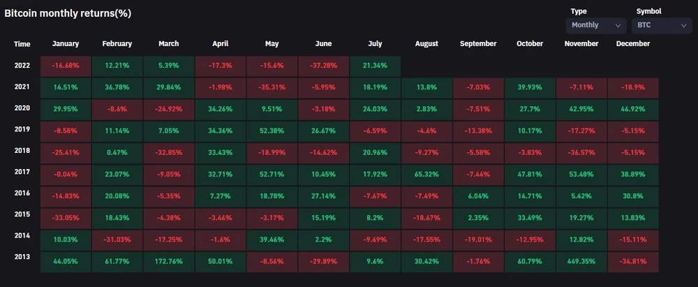 Nach Daten des Branchenportals bybt.com hat der Bitcoin seit Anfang Juli rund 21 Prozent zugelegt. Kann er diesen Vorsprung in den nächsten beiden Tagen aufrechterhalten oder gar ausbauen, wäre es die stärkste Monatsperformance der digitalen Leitwährung seit Oktober 2021, als er auf dem Weg zum damaligen Allzeithoch satte 40 Prozent zugelegt hatte.