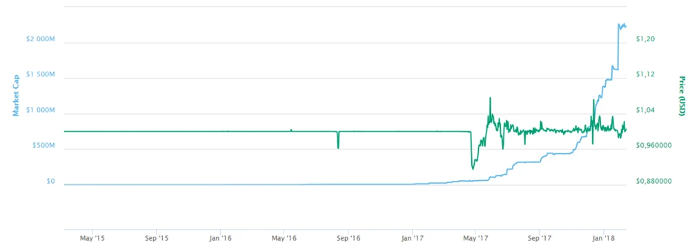 Weiterhin ist die Marktkapitalisierung von Tether 2017 ähnlich exponentiell gewachsen wie der gesamte Krypto-Markt. Waren es im Januar noch rund 15 Millionen US-Dollar, sind es Ende des Jahres knapp 1,4 Milliarden gewesen. Der wesentliche Unterschied zu den anderen Kryptowährungen liegt darin, dass USDT nicht korrigiert hat, sondern sogar noch weiter um fast das Doppelte in der Marktkapitalisierung gestiegen ist. Das „Geld“ befindet also höchstwahrscheinlich noch im Besitz von Exchange-Plattformen, da es nicht aus dem Markt genommen wurde.