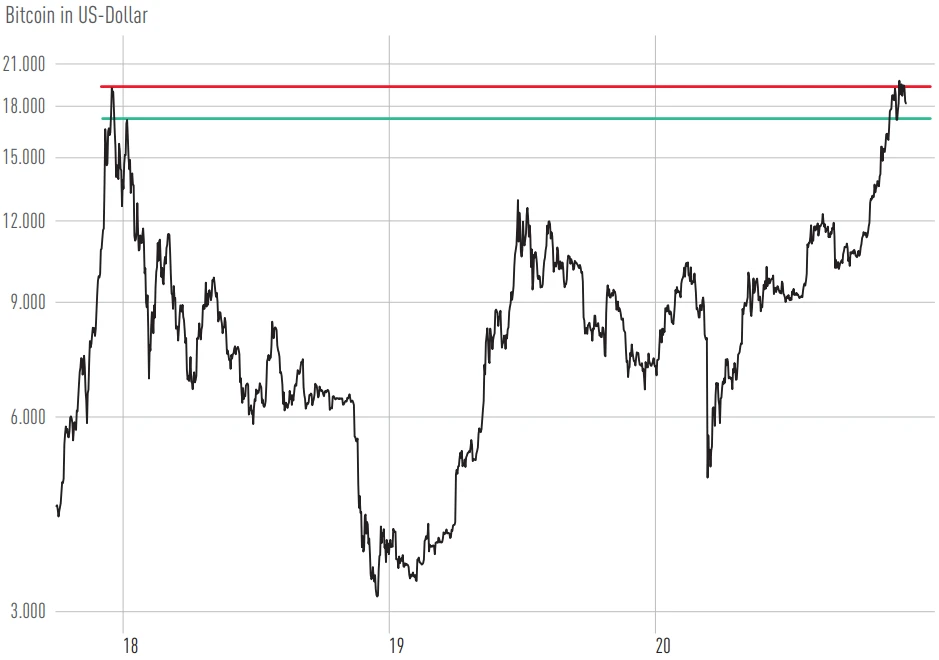 Bislang hat sich die Widerstandszone im Bereich zwischen 19.500 und 20.000 Dollar jedoch als (zu) harte Nuss erwiesen. Ein nachhaltiger Ausbruch über die 20.000er-Marke und auf neue Höchststände ist bislang nicht gelungen.