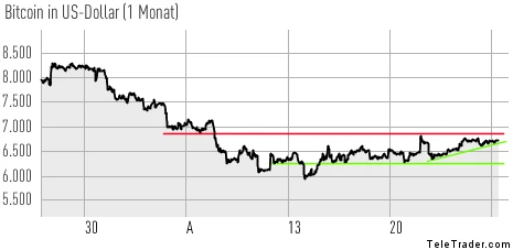 Der Seitwärtstrend, in dem sich der Bitcoin seit einigen Wochen befindet, wird damit immer enger – ein Indiz für einen möglichen charttechnischen Ausbruch, idealerweise nach oben. Auf der Oberseite gilt es nämlich, die Widerstände im Bereich von 6.800 und 7.700 Dollar erneut zu überwinden.