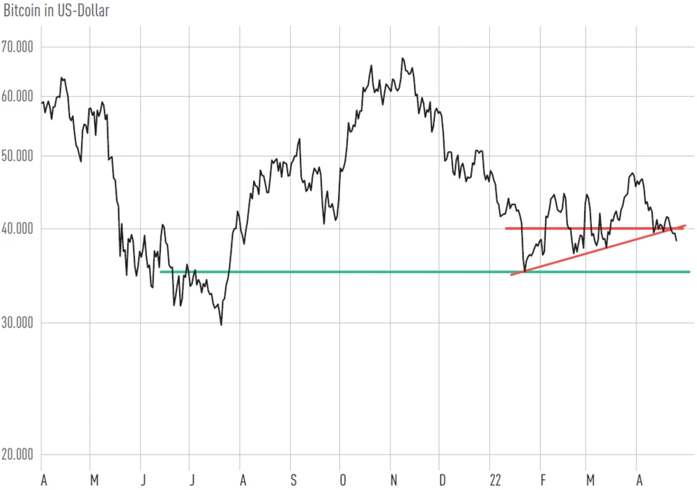 Die Schwäche der Finanzmärkte setzt sich zu Beginn der neuen Woche fort und sorgt auch am Kryptomarkt für weitere Verluste. Der Bitcoin hat die seit Mitte März aufgelaufenen Gewinne inzwischen fast komplett abgegeben und auch der Kampf um die charttechnisch wichtige 40.000-Dollar-Marke scheint erst einmal verloren.