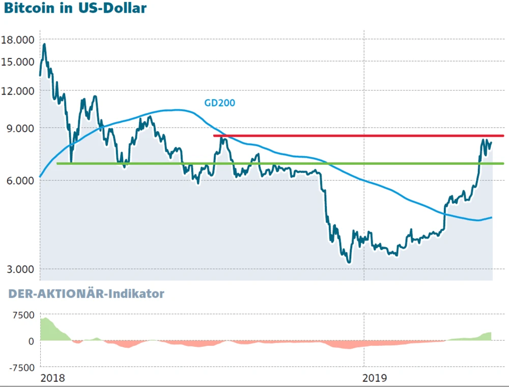 Mit dem Sprung über die runde 8.000er-Marke, rückt als nächstes der charttechnische Widerstand im Bereich von 8.200 Dollar in den Fokus. Oberhalb davon hatte der Bitcoin Mitte Mai bei 8.321 Dollar sein bisheriges Jahreshoch erreicht, dieses Niveau zunächst aber nicht halten können.