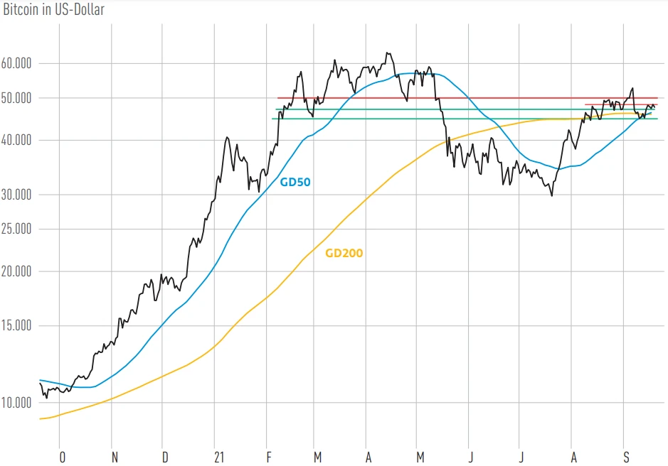 Trotz der jüngsten Schwankungen hat der Bitcoin wichtige Chartmarken wie die 200-Tage-Linie oder die horizontale Unterstützungszone im Bereich zwischen 44.000 und 45.000 Dollar verteidigt. Das übergeordnete Chartbild präsentiert sich damit unverändert bullish.