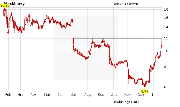 Die Strategie des neuen Chefs, Blackberry weniger auf das Endkundengeschäft auszurichten, sondern stattdessen wieder zunehmend den Sicherheitsaspekt und die Unternehmenskunden im Visier zu haben, scheint bei den Anlegern anzukommen. Die Aktie hat sich seit Dezember verdoppelt. Kurzfristig scheint die Aktie überhitzt, doch könnte der Kurs bei anhaltend gutem Newsflow wieder in Richtung 18 Dollar steigen. Mutige Anleger platzieren bei 10,00 Kanada-Dollar (umgerechnet etwa 6,75 Euro) ein Abstauberlimit.