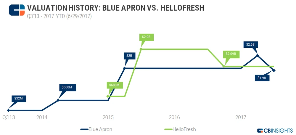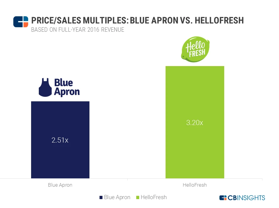 Allerdings steht Hello Fresh bei Umsatzwachstum und EBITDA-Marge sogar noch etwas schlechter da als der US-Konkurrent Blue Apron – obwohl die Berliner ihren Umsatz 2016 um satte 96 Prozent auf 597 Millionen Euro steigern und die operativen Verluste senken konnte. Gemessen am Verhältnis der jeweiligen Bewertung bei der letzten Finanzierungsrunde und dem 2016er-Umsatz war Blue Apron laut einer Berechnung von CB Insights mit einem Multiple von 2,51 zuletzt auch noch günstiger als Hello Fresh (3,2x).