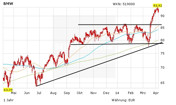 Nach dem Ausbruch aus dem mehrmonatigen Seitwärtstrend schnellte die BMW-Aktie bis auf über 94 Euro nach oben. Das war etwas zu viel des Guten. Am Montag setzte in Folge eines schwachen Gesamtmarkts die Konsolidierung ein. Indes hat die Deutsche Bank die Einstufung für BMW auf "Buy" mit einem Kursziel von 103 Euro belassen. Der Autobauer bleibe für das laufende Jahr optimistisch und rechne mit einer positiven Preisgestaltung insbesondere in Europa sowie mit