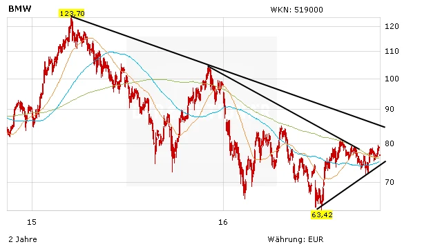 Die Aktie litt in den letzten Tagen wie auch VW und Daimler unter der US-Wahl. Donald Trump könnte durchaus zu Importzöllen greifen, um Produkte aus den USA zu fördern. Davon würden GM, Ford und FiatChrysler profitieren. Dennoch: BMW und Daimler haben viele Produktionsstätten in den USA aufgebaut, sollten also nicht so stark unter Trump leiden wie VW, die in erster Linie Werke in Lateinamerika und Mexiko haben. Die Aktie von BMW läuft weiterhin seitwärts, notiert aber weiterhin über der wichtigen 200-Tage-Trendlinie. Mit Überwinden der Widerstandslinie bei 80 Euro kann man einen Fuß in die Tür stellen und eine erste Position kaufen.