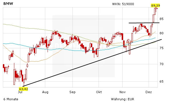 Vor allem in den letzten Tagen legten die Autowerte in einem freundlichen Marktumfeld wieder deutlich zu. Dabei konnte BMW besser als die Konkurrenten Daimler und VW abschneiden. Nach dem rasanten Anstieg kann es durchaus zu einer Konsolidierung bis in den Bereich 86,75 Euro kommen. Nach wie vor sind Rücksetzer neue Kaufchancen. Das Kursziel lautet 95,00 Euro.