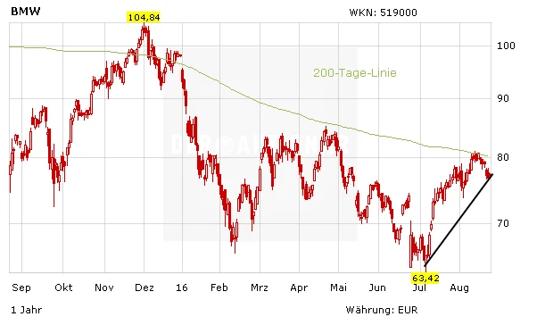 Im schwachen Marktumfeld ist auch die BMW-Aktie in den vergangenen Tagen etwas unter Druck geraten. Der Sprung über die wichtige 200-Tage-Linie lässt weiter auf sich warten. Noch zeigt der Trend aber nach oben. Die Elektromobilität soll dem Autobauer eine erfolgreiche Zukunft verschaffen.